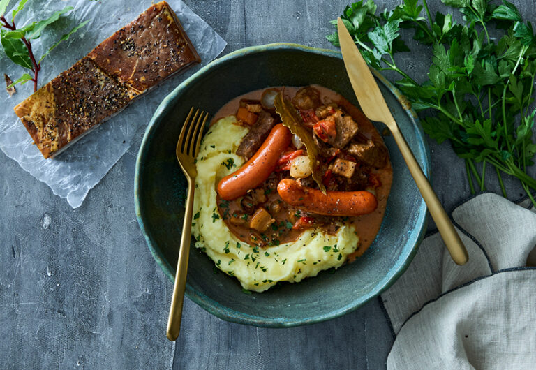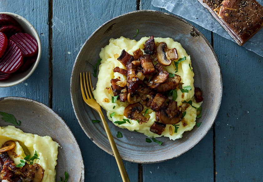 Brændende kærlighed er en ægte klassiker i det danske køkken, og her får du opskriften i en ny, fyldig version. Den cremede kartoffelmos er rørt med frisk persille og får selskab af sprødstegt bacon, bløde løg og champignon. Den ellers fyldige ret får en god syrlighed fra hakket rødbede på toppen. Opskriften er nem, mættende og en sikker vinder på middagsbordet, når hele familien skal samles.