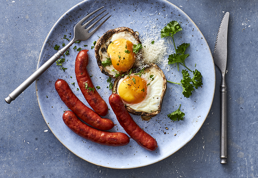 Portobellosvampe med æg er lækkert tilbehør til en brunchpølse og et skønt alternativ til røræg. Prøv vores Chorizobrunchpølse, som er godt krydret og har en god eftersmag.