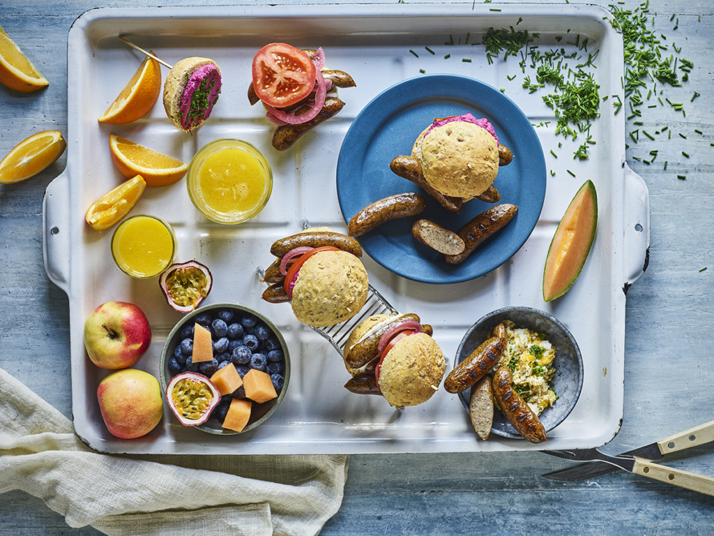 - Smør underdelen af bollen med mayonaise, læg dine ynglings brunchpølser ovenpå sammen med syltede løg og tomat og slut af med at smøre rødbedehumus på øverste bolle før du samler din slider. Pynt evt. med purløg.