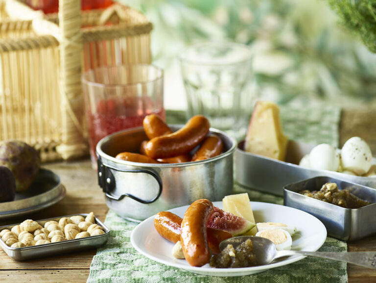 - I denne har vi brugt Slagter Lampe brunchpølser m. ramsløg, men du kan også fint bruge andre varianter.