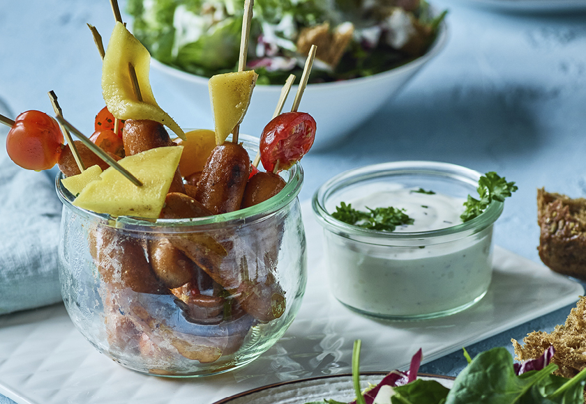 Små brunchspyd med brunchpølser, mango og tomat er en farverig og smagfuld brunchsnack, der både pynter på bordet og er nem at servere. Det søde fra mangoen og tomaten og det krydrede fra pølserne spiller perfekt sammen. Og med en frisk persilledip ved siden af får du en snack, der både passer til morgenbordet, til salat og brød eller som en lille hapser i madpakken.