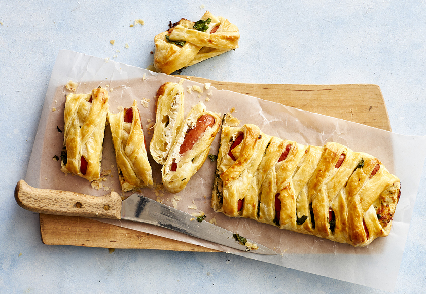Butterdejsstang er altid en favorit blandt hele familien. Vi har lavet en nem og sjov udgave med hele brunchpølser, flødeost og krydderurter, som giver et fint snit med kig til de hele pølser.