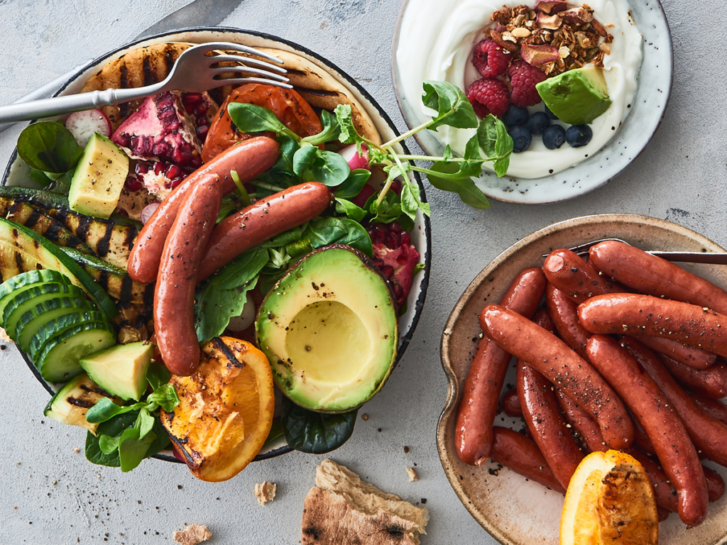 Til Slagter Lampes brunchpølser kan du med fordel lave grillet melon og squash samt radiser og granatæble. Steg også gerne grønkål med honning og lime. Den grove salat kan evt. assisteres af en grøntsagsomelet.