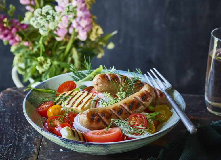 Squash sæsonen starter i juli, lige i tide til at blive brugt som grilltilbehør. Squash smager skønt og kan tilberedes på mange forskellige måder. Vi har lavet et grillspyd med squash og halloumi, som er perfekt som tilbehør til grillpølser. Her har vi brugt vores Bacon-Ramsløg Frankfurter, men du kan sagtens bruge din egen pølsefavorit. Husk at lægge træspyddene i blød i vand, så de ikke brænder på grillen.