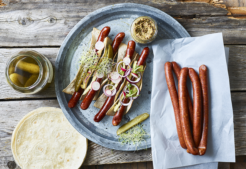 Lav en alternativ hotdog, hvor du erstatter brødet med en tortilla. Det giver en helt anden smagsoplevelse. Top din hotdog med rødløg, radisse, sennep, syltet agurk og evt. spirer. Her har vi brugt vores Sønderjysk Grillpølse.