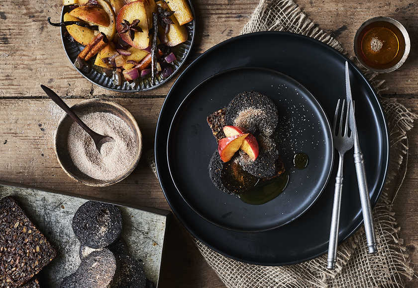 Når julen nærmer sig, er det igen tid til at nyde de lækre julespecialiteter som blodpølse. Traditionelt spises blodpølse med sirup, kanelsukker og æblemos. Vi har her lavet en anden udgave af æblemos af stegte æbler med vanilje, rødløg og balsamicoeddike. Server hele herligheden på en skive rugbrød, der er ristet sprødt.