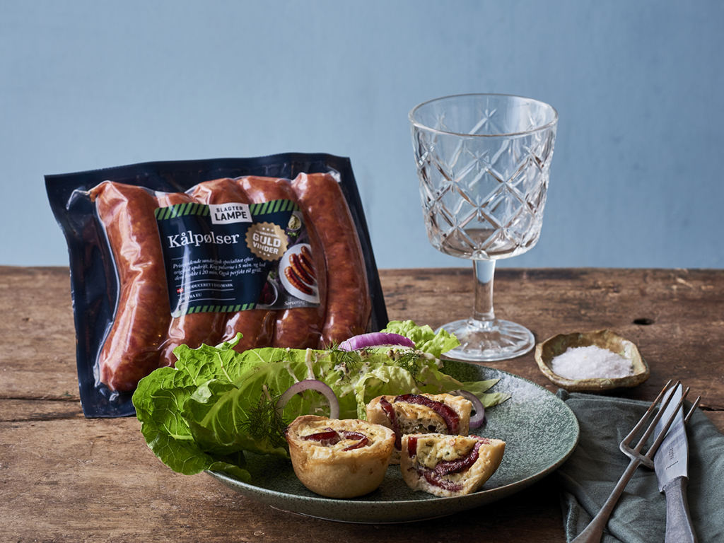 Små lune tærter vækker altid begejstring på frokostbordet. Prøv disse skønne tærter med den røgede kålpølse og purløg.