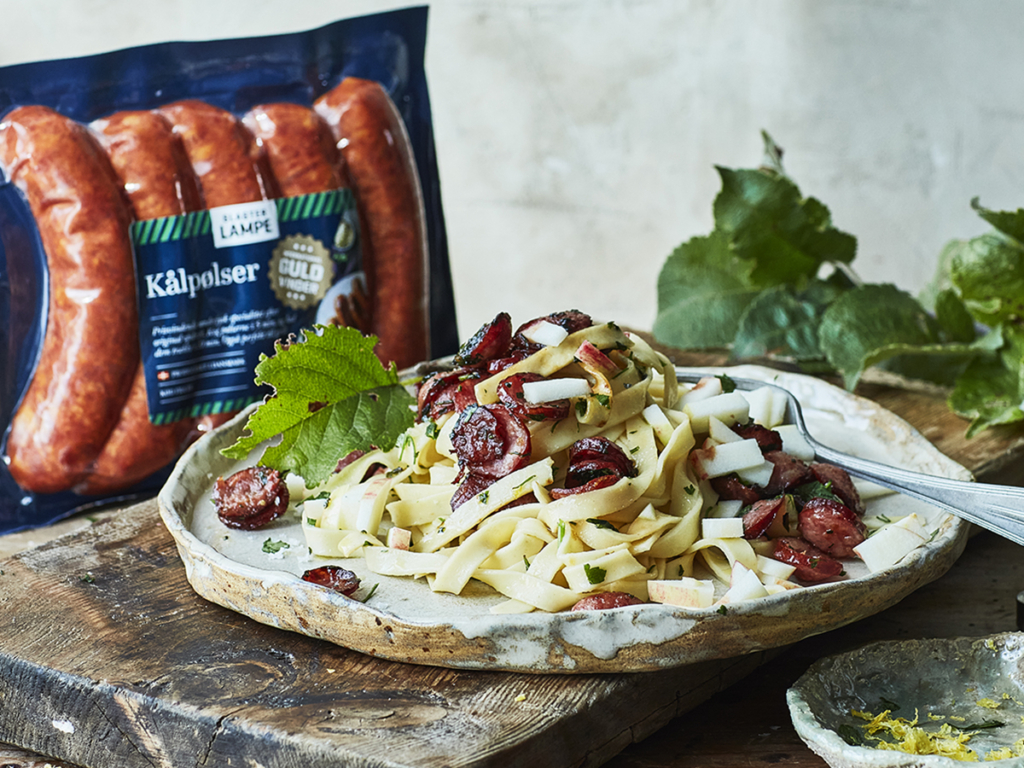 Den røgede kålpølse passer godt til pastaretter. Skær den i skiver og rist den på panden indtil skiverne karameliserer, så har du lækker, krydret smag til din pasta.