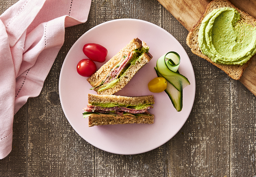 En supernem og smagfuld sandwich til frokosten. Vi har lavet en grøn spinathummus til, brug gerne en færdigkøbt hummus, så bliver det ikke lettere. Smør brødet med flødeost med paprika og tilføj skiver af vores Sønderjyske Spegepølse.
