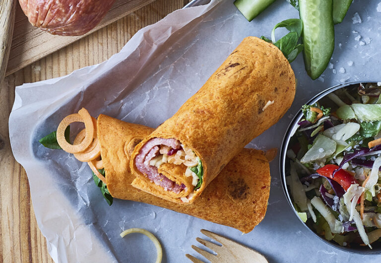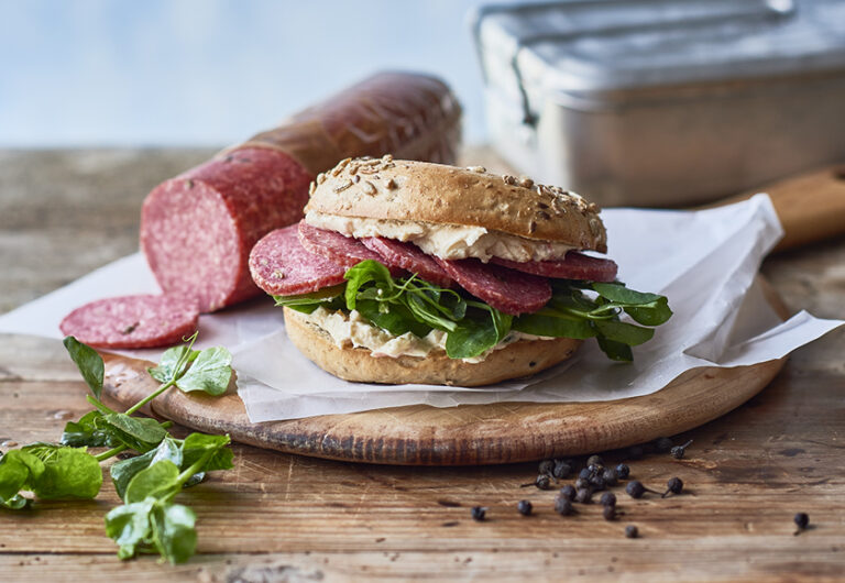 En sandwich bliver ekstra god med Sønderjysk Spegepølse, der giver fylde og smag, kombineret med en frisk og cremet basilikumcreme. Denne opskrift bruger koldhævede manitoba boller, som giver en blød og luftig base, men du kan også sagtens vælge ristet rugbrød for en mere rustik variant.