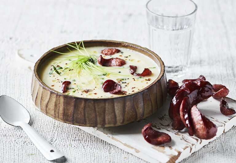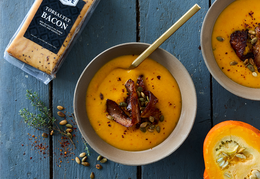 Leder du efter en nem opskrift på efterårssuppe, der både er sund, mættende og fuld af smag? Så skal du prøve hokkaidosuppe med linser og bacon. Den cremede græskarsuppe er lavet på hokkaido, som giver en dejlig rund og sød smag, mens linserne gør suppen ekstra fyldig. Topper du med sprødstegt bacon, får du den perfekte kombination af det bløde og det sprøde.