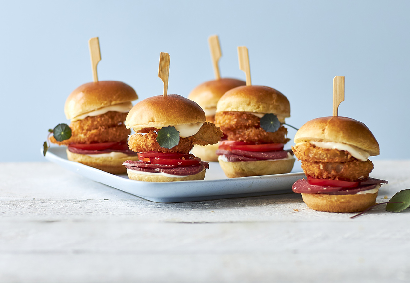 Fyldig Oksespegepølse, stegte løgringe, mayonnaise og tomat udgør en perfekt kombination i denne mini burger. Lav gerne lidt ekstra løgringe, de smager himmelsk.