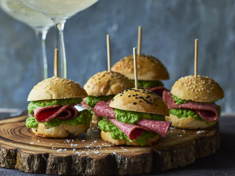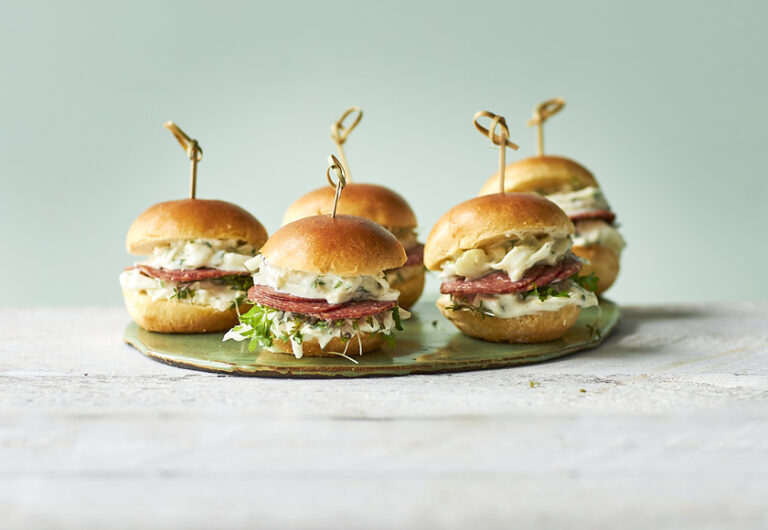 Rucola-slaw med citronskal er en frisk og velsmagende salat, der går godt til vores delikate Pebersalami. Kombinationen af det sprøde fra salaten og vores bløde lækre spegepølse i en slider vil helt sikkert være et hit blandt dine gæster.