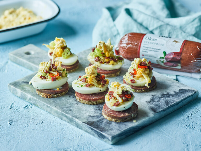 Vores spegepølser har den perfekte størrelse og tørhed til en tapas anretning. Pift din anretning op med sprøde porrer, oliven og wasabi mayo. Server brød og chips til sammen med et koldt glas øl.