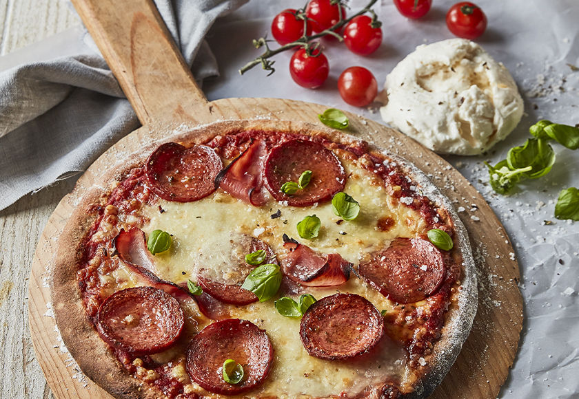 Leder du efter en pizza med masser af smag og et lille kick? Vores opskrift på pizza med jalapeñosalami kombinerer den sprøde bund med en smagfuld tomatsauce, smeltet ost og skiver af spicy Tapas Jalapeñosalami. Vi har toppet pizzaen med burrata-ost, for hvem elsker ikke det? Den færdige pizza har en intens, men afbalanceret varme, der gør hver bid til en lækker smagsoplevelse.