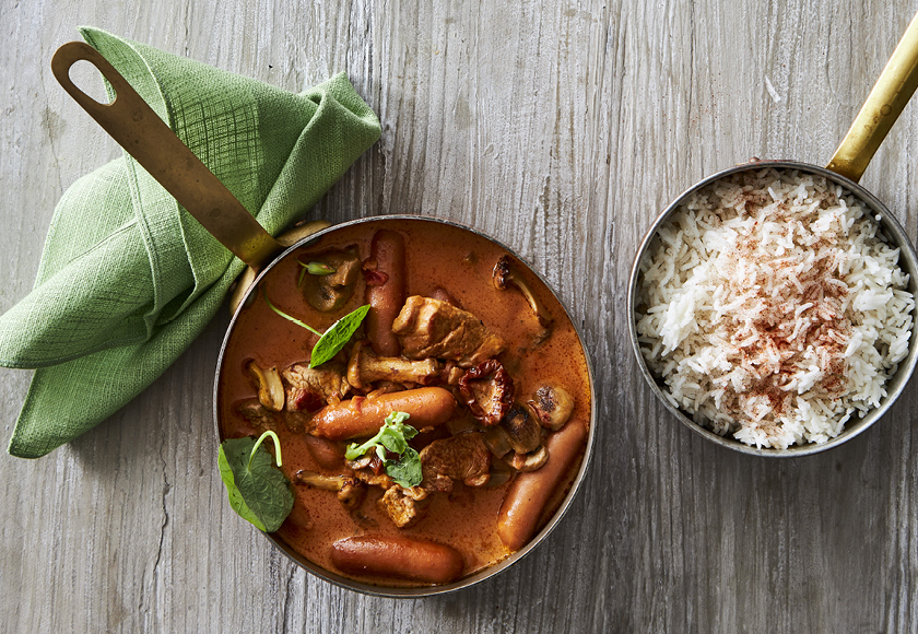 Mørbradgryde med pølser og champignon smager dejligt og er et hit hos de fleste. Vi har brugt vores velsmagende og sprøde Cocktailpølser og tilføjet soltørrede tomater for ekstra smag.