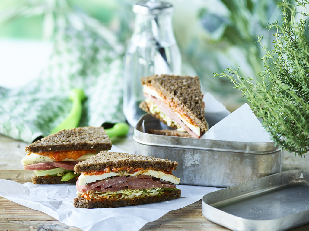 Lav en rugbrøds klapsammen med peberfrugt tapenade, kartoffelspegepølse og grillet halloumi til sommerens picnic eller som et lækkert alternativ til madpakken.