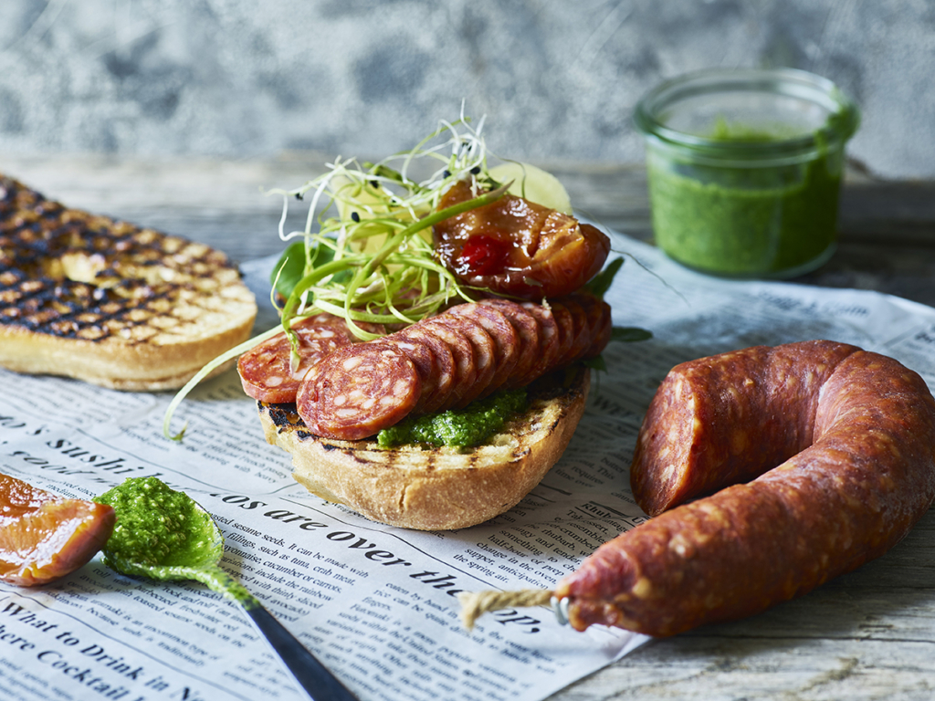 Den krydrede og røgede chorizopølse nydes på ristet brød smurt med grøn pesto. Dertil er det lækkert med syltede blommer. Den søde smag fra blommerne passer perfekt til tapas og det salte køkken generelt.