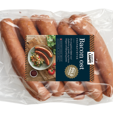 Er du til cheddarost og sprødt stegt bacon, så er denne grillpølse noget for dig. Vores Bacon-oste Frankfurter har vundet guld ved international fagmesse for både smag og kvalitet. En rigtig god slagterpølse, der kan serveres hele året stegt på grill eller pande. Pakken indeholder 10 stk.