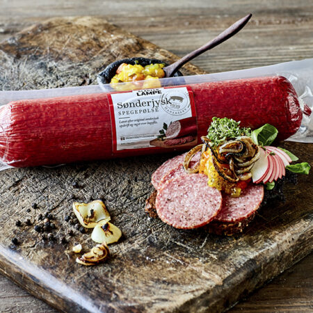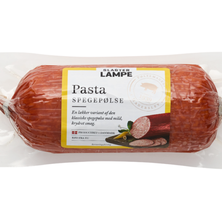 En moderne spegepølse, hvor vi har erstattet spæk med pasta og tilsat vores egen krydderiblanding, som giver spegepølsen en mild krydret smag.